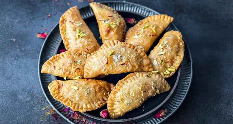 Gujiya is one of the most loved sweets prepared during Holi. It is a deep-fried pastry filled with a rich mixture of khoya (mawa), sugar, and dry fruits like almonds and cashews. The outer layer is crisp, while the inside is soft and sweet, giving a perfect balance of texture and taste.