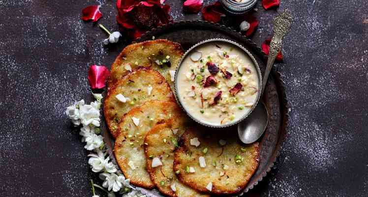 - Soak and Serve: Dip the fried malpua in warm sugar syrup for about a minute. Remove and place on a serving plate. Pour rabri over the top and garnish with nuts.