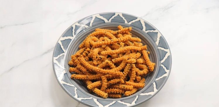Murukku is a crispy, spiral-shaped snack made from rice flour and urad dal flour, often flavored with sesame seeds, cumin, and a pinch of salt. It is deep-fried until golden brown and crunchy. Its long shelf life also allows it to be prepared in advance, so families can enjoy it throughout the festival without any hassle. Its crunchy texture and savory flavor make it a perfect snack for tea time.