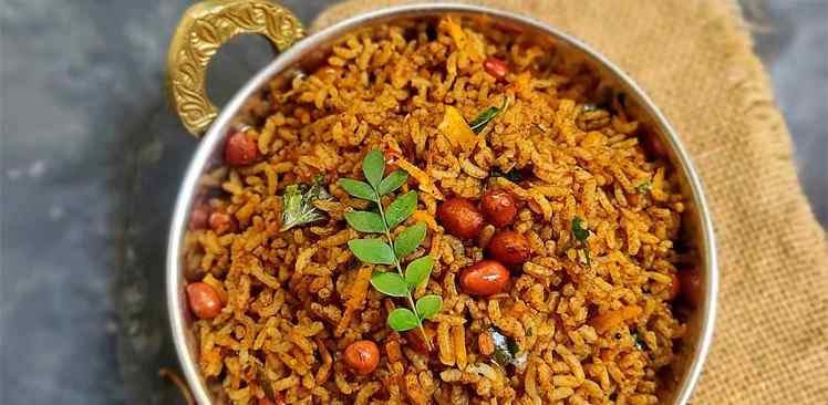 Tamarind Rice, also known as Puliyodarai or Pulihora, is a flavorful South Indian rice dish that is commonly prepared during festivals like Pongal. It is made by mixing cooked rice with a tangy tamarind paste, jaggery, and a blend of aromatic spices. The dish gets its distinct taste from ingredients like tamarind, mustard seeds, curry leaves, peanuts, dry red chilies, and spices, which together create a perfect balance of sour, spicy, and mildly sweet flavors. It pairs well with papad, curd, or coconut chutney.